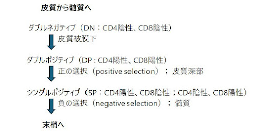 それから、胸腺内におけるT細胞の分化過程を概観した。T細胞は自己MHCと抗原の断片(ペプチド)の両方を認識しなければならないので、そのようなレセプターが自己には反応しないように「教育」してから末梢に出さなければならない。下の略図にあるように、まずMHCと適度に反応するレセプターが選択され(正の選択)、その後に自己反応性を除去する負の選択が行われ、末梢に放出される。